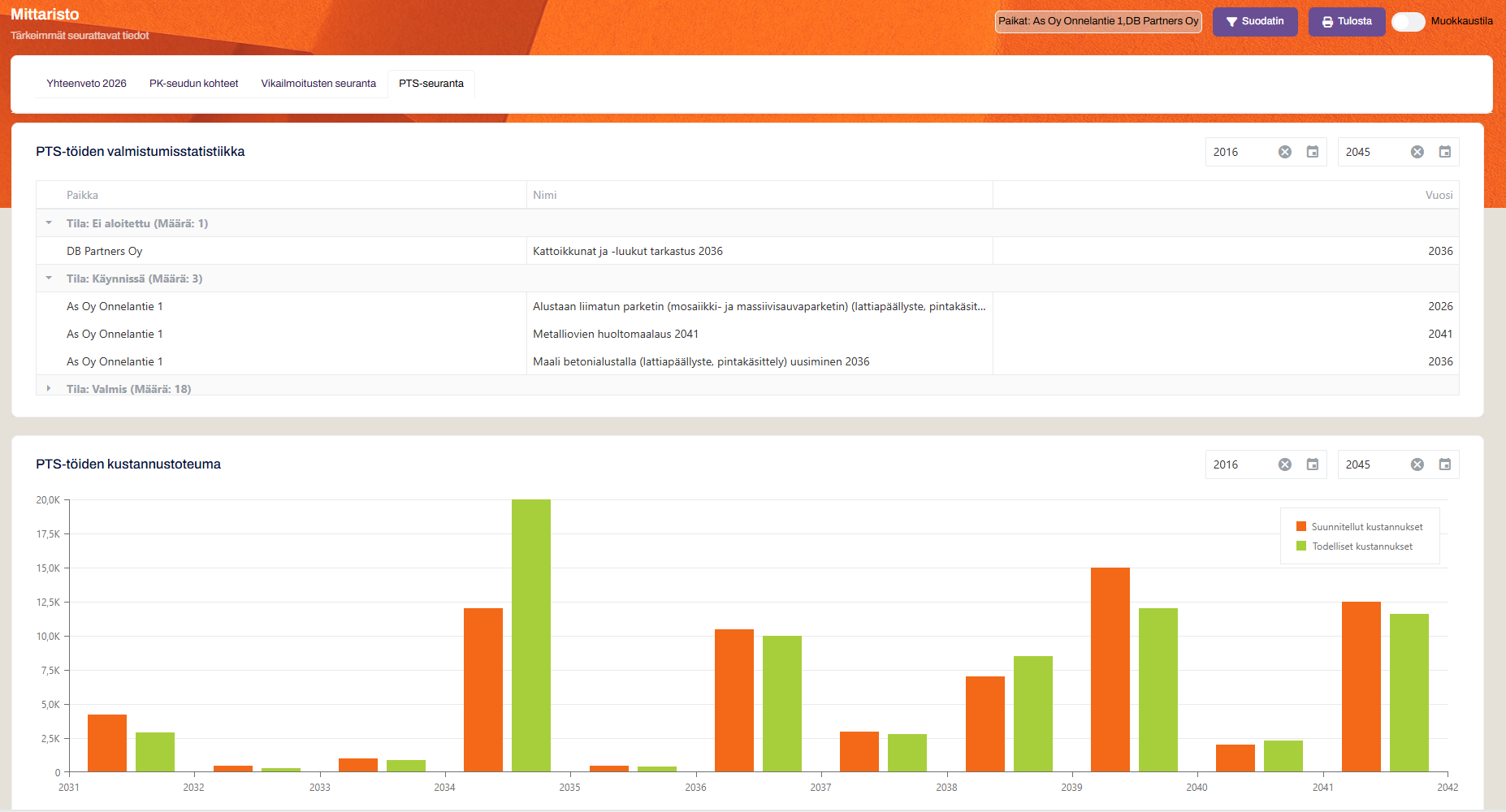 Suunnittele ja seuraa kiinteistön ylläpitoa digitaalisesti. Näe toimenpiteet, aikataulut ja eteneminen yhdellä silmäyksellä.