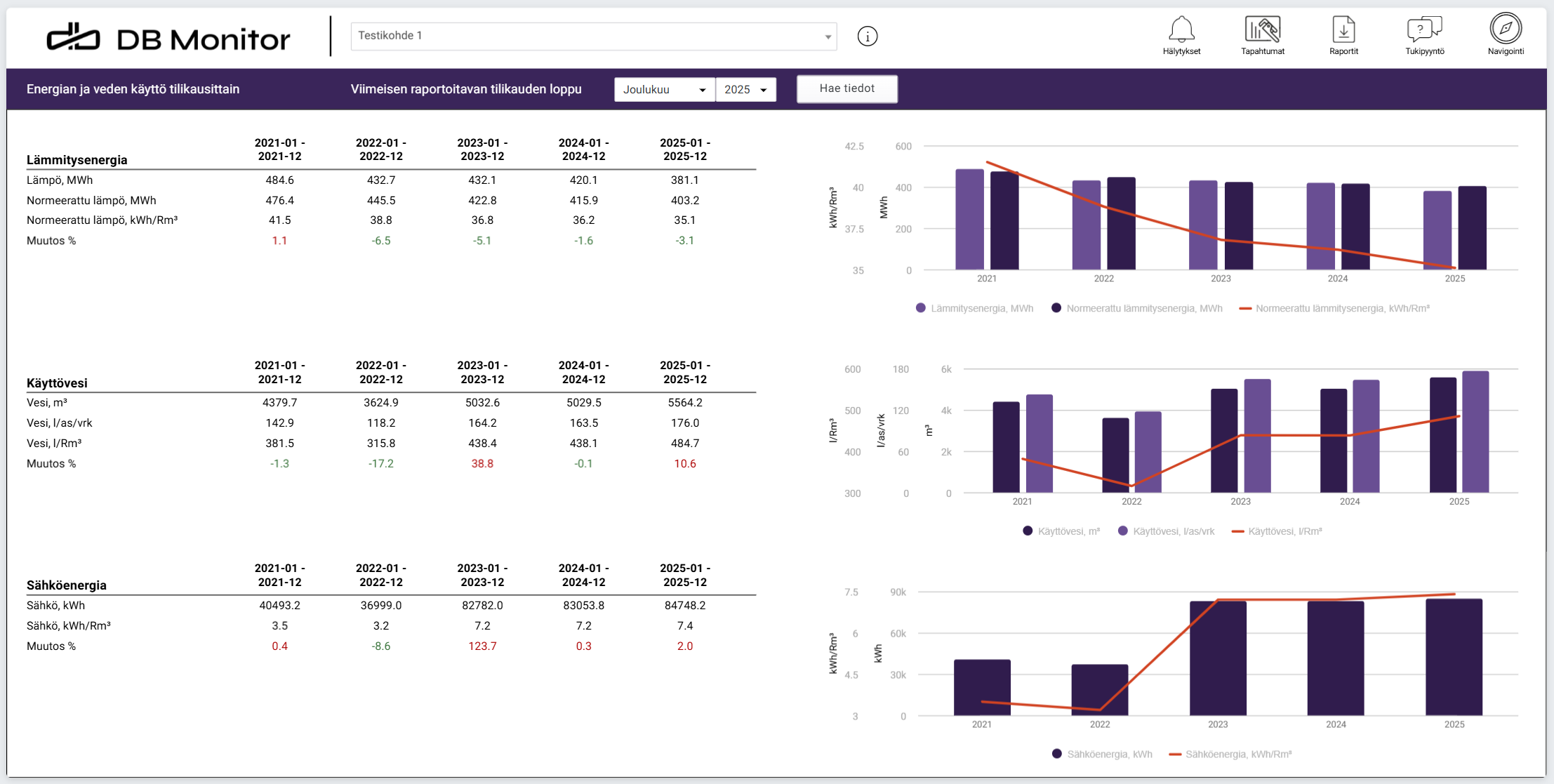 DB Monitor kokoaa kiinteistöjen keskeisen datan yhteen ja muuttaa sen helposti hyödynnettävään ja vertailtavaan muotoon. Reaaliaikainen tieto ja historiadata tukevat analyysiä, auttavat tunnistamaan poikkeamat ajoissa ja luovat vahvan perustan päätöksenteolle.